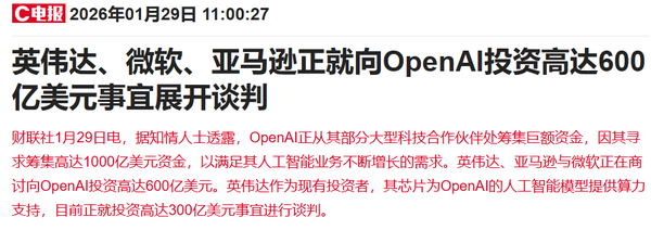 [CNMO科技消息]1月29日,据“财联社”报道,英伟达、微软、亚马逊正就向OpenAI投资高达600亿美元事宜展开谈判。消息人士透露,OpenAI正从其部分大型科技合作伙伴处筹集巨额资金,因其寻求筹集高达1000亿美元资金,以满足其人工智能业务不断增长的需求。